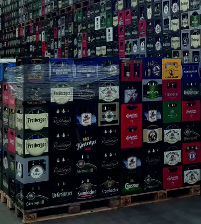 4. Bei der Palettierung der sortierten Kiste: Nach der Feinsortierung werden die Leergutkisten (bei Offline-Sortieranlagen) wieder palettiert. Wie auch bei der Depalettierung kann diese Tätigkeit durch einen Roboter durchgeführt werden. Je nach Sortenvielfalt und Leergutmenge bietet sich an dieser Stelle eine Unterscheidung zwischen den Hauptsorten, die bei einem Palettierroboter für eine ordentliche Auslastung sorgen, und den Nebensorten, die aufgrund ihrer geringen Menge besser händisch palettiert werden, an.
